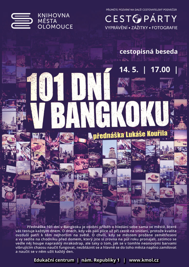 Přednáška 101 dní v Bangkoku je osobní příběh o hledání sebe sama ve městě, které vás testuje každým dnem. O dnech, kdy vás pálí plíce už při cestě na snídani, protože kvalita ovzduší patří k těm nejhorším na světě. O chvíli, kdy se městem prožene zemětřesení a vy sedíte na chodníku před domem, který jste si zrovna na půl roku pronajali, zatímco se vedle něj houpe naprasklý mrakodrap, ale taky o tom, jak se v tomhle neonovými barvami vibrujícím chaosu naučit fungovat, nezbláznit se a hlavně se do toho města naplno zamilovat a naučit se v něm užít každý den.