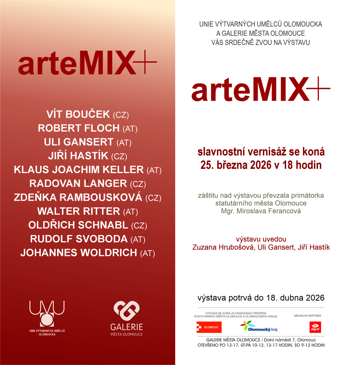 Unie výtvarných umělců Olomoucka ve spolupráci s Galerií města Olomouce uvádí mezinárodní výstavní projekt arteMIX+. Expozice nabízí dialog mezi českou a rakouskou výtvarnou scénou, přičemž svá díla zde představuje jedenáct autorů: Vít Bouček, Robert Floch, Uli Gansert, Jiří Hastík, Klaus Joachim Keller, Radovan Langer, Zdeňka Rambousková, Walter Ritter, Oldřich Schnabl, Rudolf Svoboda a Johannes Woldrich.