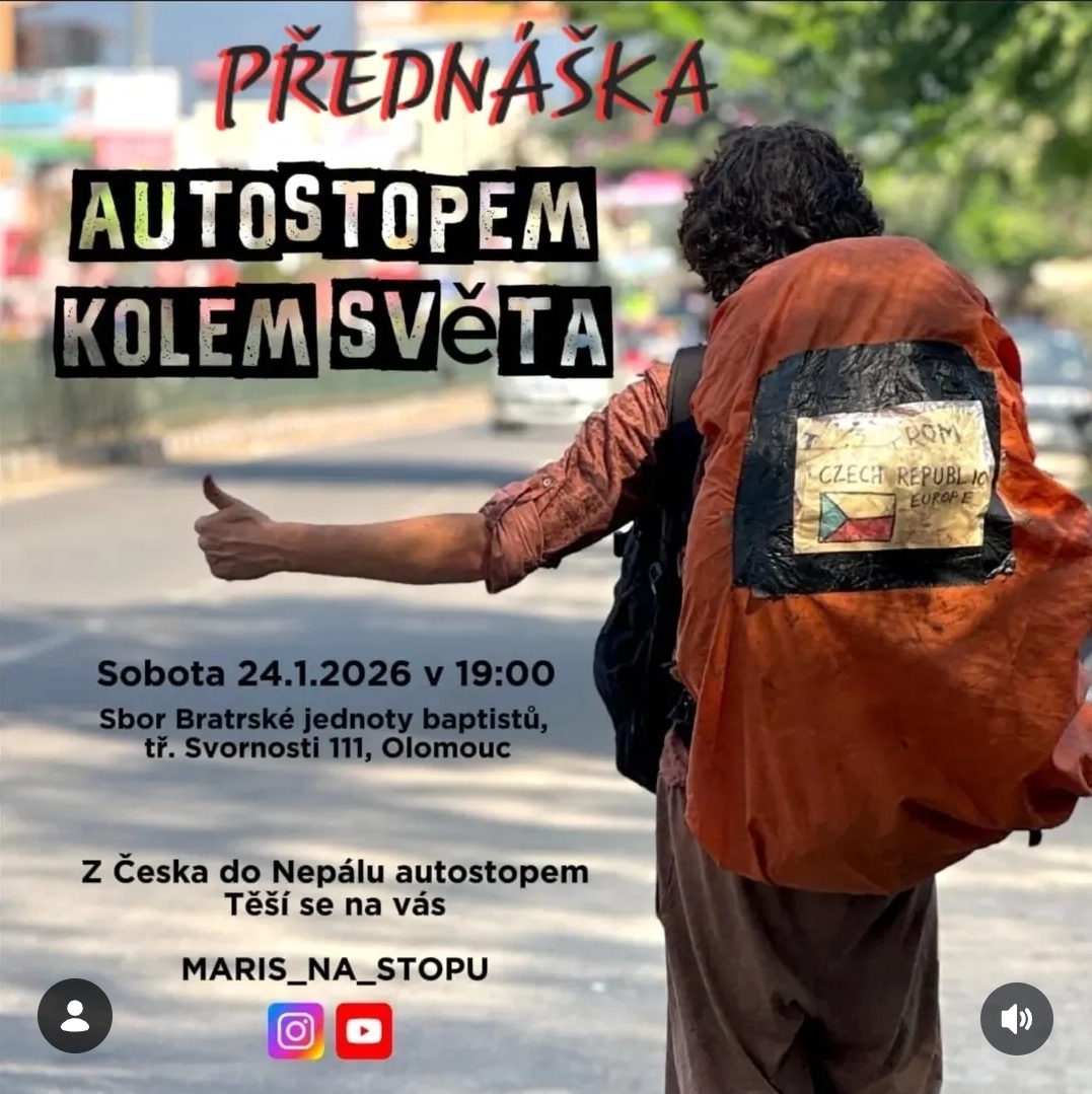 Na cestě autostopem je už rok, nyní své cestování na krátkou dobu přerušil (převážně skrz Vánoce) a brzy se chystá vyrazit dál: "Než vyrazím stopovat dál na moře, tak udělám jednu přednášku o mé dosavadní cestě a to v bývalém kině v mé rodné Olomouci. Zatím jsem vyjel z Evropy přes Balkán, Turecko, Arménii s Gruzií, Írák, arabský poloostrov a Indii s Nepálem. Pokud budete chtít si poslechnout o tom, jak má cesta probíhá, co zajímavého se mi během cesty přihodilo, co mě čeká a nebo třeba jen co bych vám mohl předat za tipy ohledně cestování stopem, tak jste srdečně zváni".