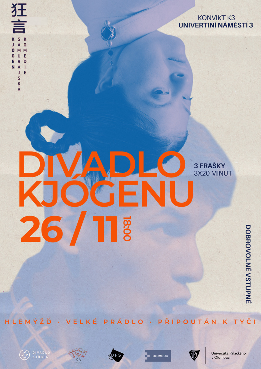 Tři samurajské komedie v podání Divadla Kjógen již 26.11 od 18:00 v Divadle K3. Těšit se můžete na tři frašky, každá v rozmezí 20 až 30 minut, konkrétněji představení KAGJÚ (Hlemýžď), SUSUGIGAWA (Velké prádlo) a BÓŠIBARY (Připoután k tyči).