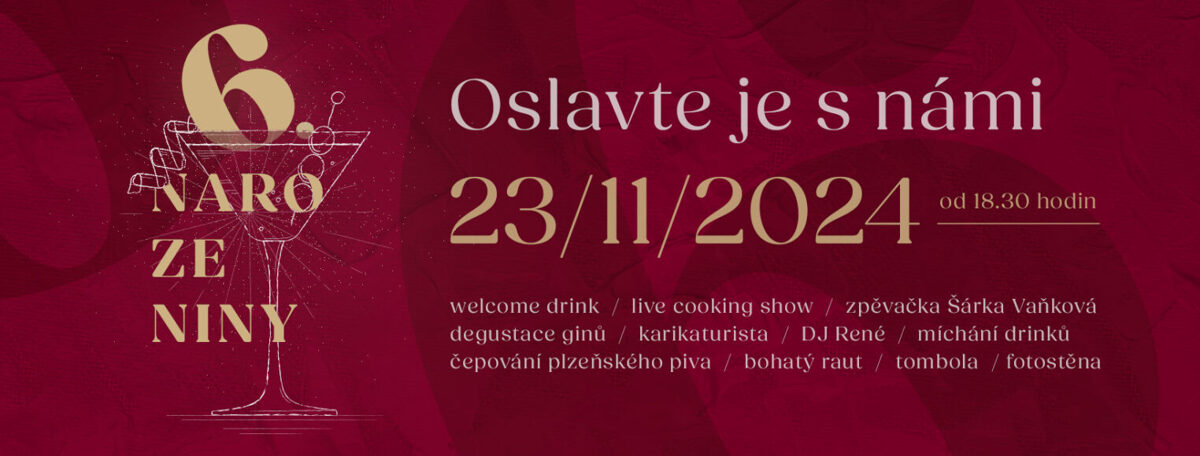 Začneme osvěžujícím welcome drinkem, následovat bude bohatá rautová nabídka připravená našimi šéfkuchaři. Na místě bude karikaturista, který vám vytvoří vtipné karikatury, a také proběhne degustace prémiových ginů. Během večera vám zazpívá Šárka Vaňková. Pokud máte rádi pivo, můžete se těšit na čepování plzeňského piva. Během live cooking show vám náš šéfkuchař předvede své umění, zatímco barman bude míchat skvělé drinky dle vašich přání. Nezapomeňte se také vyfotit u naší foto stěny na památku tohoto skvělého večera. Večer zakončíme skvělou hudbou v podání DJ Reného, který rozproudí atmosféru a postará se o to, abyste si oslavu maximálně užili. Na závěr večera se můžete těšit i na bohatou tombolu s cenami v celkové hodnotě 15 000 Kč.