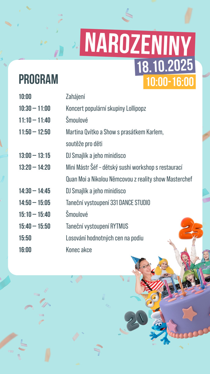Sobota 18. října bude patřit oslavám dvacátých narozenin obchodního centra Olomouc CITY. Těšit se můžete na bohatý program plný hudby, tance, soutěží, zábavy i narozeninových překvapení.