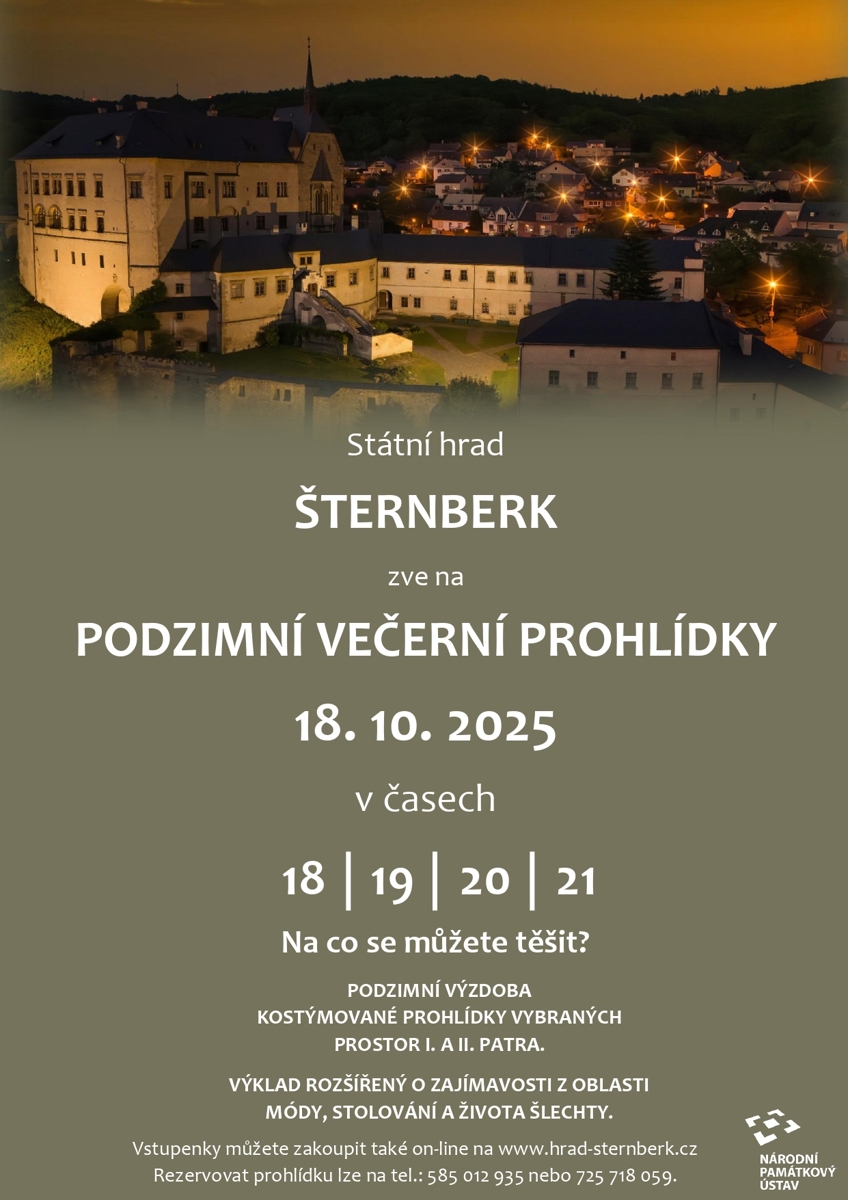 Státní hrad Šternberk zve všechny návštěvníky na Podzimní večerní prohlídky. Prohlídky se uskuteční v sobotu 18. října 2025. V uvedený den budou návštěvníkům k dispozici celkem 4 prohlídky v časech 18, 19, 20 a 21 hodin.