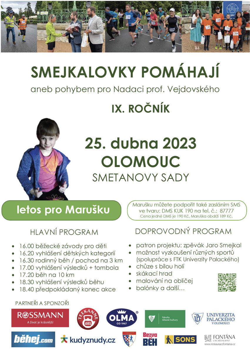 Zaběhnout si tří nebo desetikilometrovou trať a podpořit dobrou věc, konkrétně nákup pomůcek pro slabozrakou Marušku. To je cíl už devátého ročníku akce Smejkalovky pomáhají, který se bude konat v úterý 25. dubna ve Smetanových sadech. Začátek je v 16 hodin, připraven j i bohatý doprovodný program.