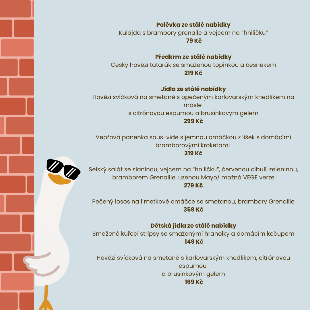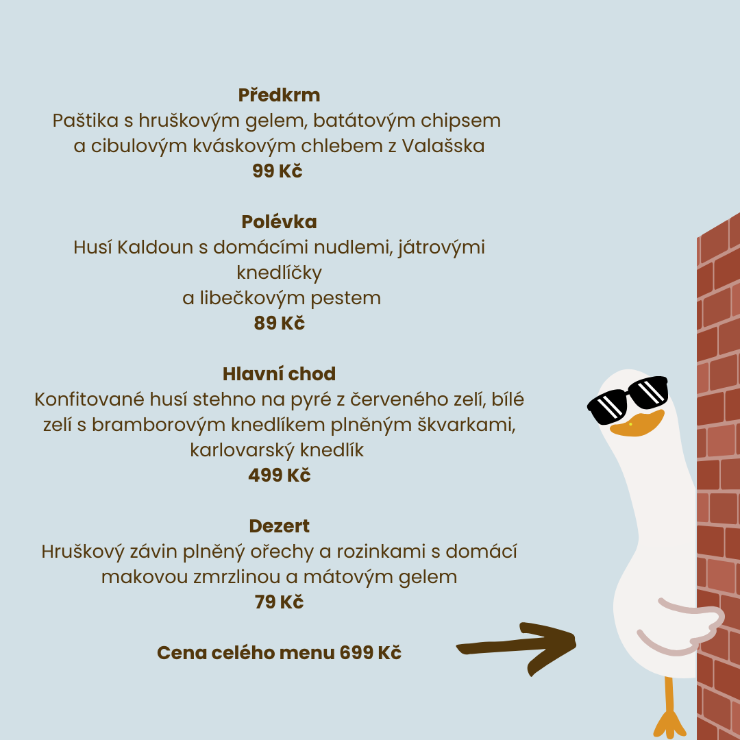 Kromě husích specialit můžete ochutnat oblíbené pochoutky ze stálého menu a můžete ochutnat jak vybrané pokrmy, tak si objednat celé menu.