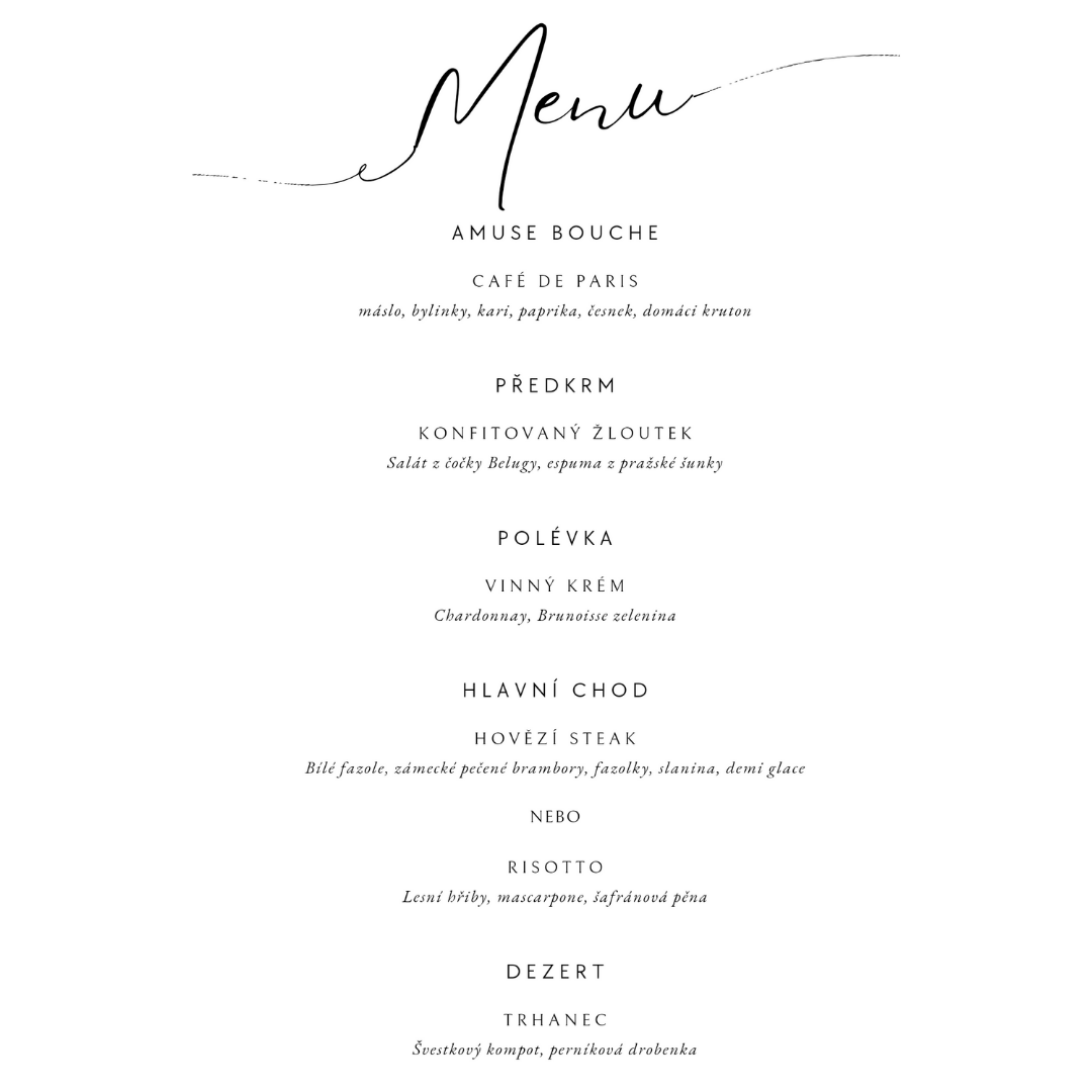Z hlavního chodu si mohou hosté vybrat z hovězího steaku z vlastního chovu nebo je v nabídce risotto s houbami pro vegetariány. K menu nebude chybět prosecco jako přípitek a dáreček na závěr.