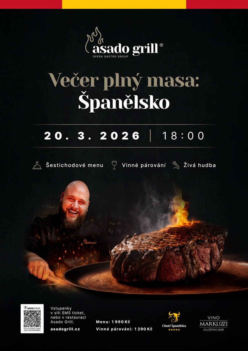 Restaurace Asado grill v Olomouci připravila pro milovníky kvalitní gastronomie tematický večer s názvem Večer plný masa: Španělsko. Akce je zasvěcena poctivým masovým chodům, ohni a výrazným chutím. Návštěvníci se mohou těšit na syté porce připravované z prémiových kusů hovězího masa za využití technik staření, uzení a grilování.