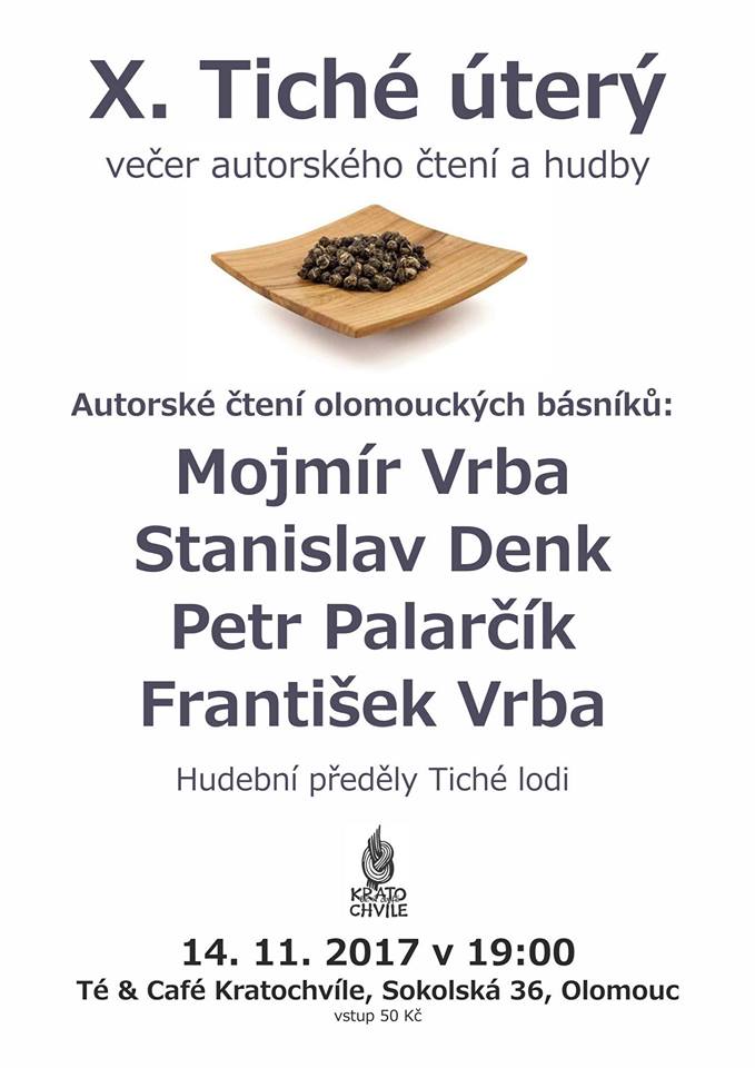 Srdečně vás zveme na X. Tiché úterý, na kterém vystoupí olomoučtí básníci Mojmír Vrba, Stanislav Denk, Petr Palarčík a František Vrba. Hudební předěly Tiché lodi.
