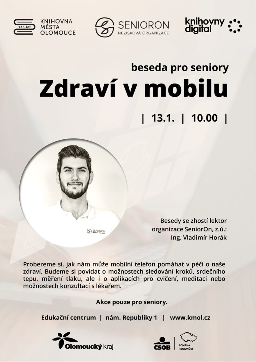 Přijďte se dozvědět, jak nám může mobilní telefon pomáhat v péči o naše zdraví. Budeme si povídat o možnostech sledování kroků, srdečního tepu, měření tlaku, ale i o aplikacích pro cvičení, meditaci nebo možnostech konzultací s lékařem.
