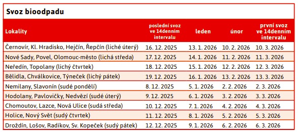 Zimní období pozmění termíny pro svoz bioodpadu. Pravidelný čtrnáctidenní svoz ze speciálních hnědých 240 litrových nádob bude omezen od prosince 2025 do března 2026. Poslední prosincové svozy, mimořádné svozy v lednu a v únoru včetně zahájení pravidelných svozů v březnu 2026 jsou pro jednotlivé lokality uvedeny v tabulce.
