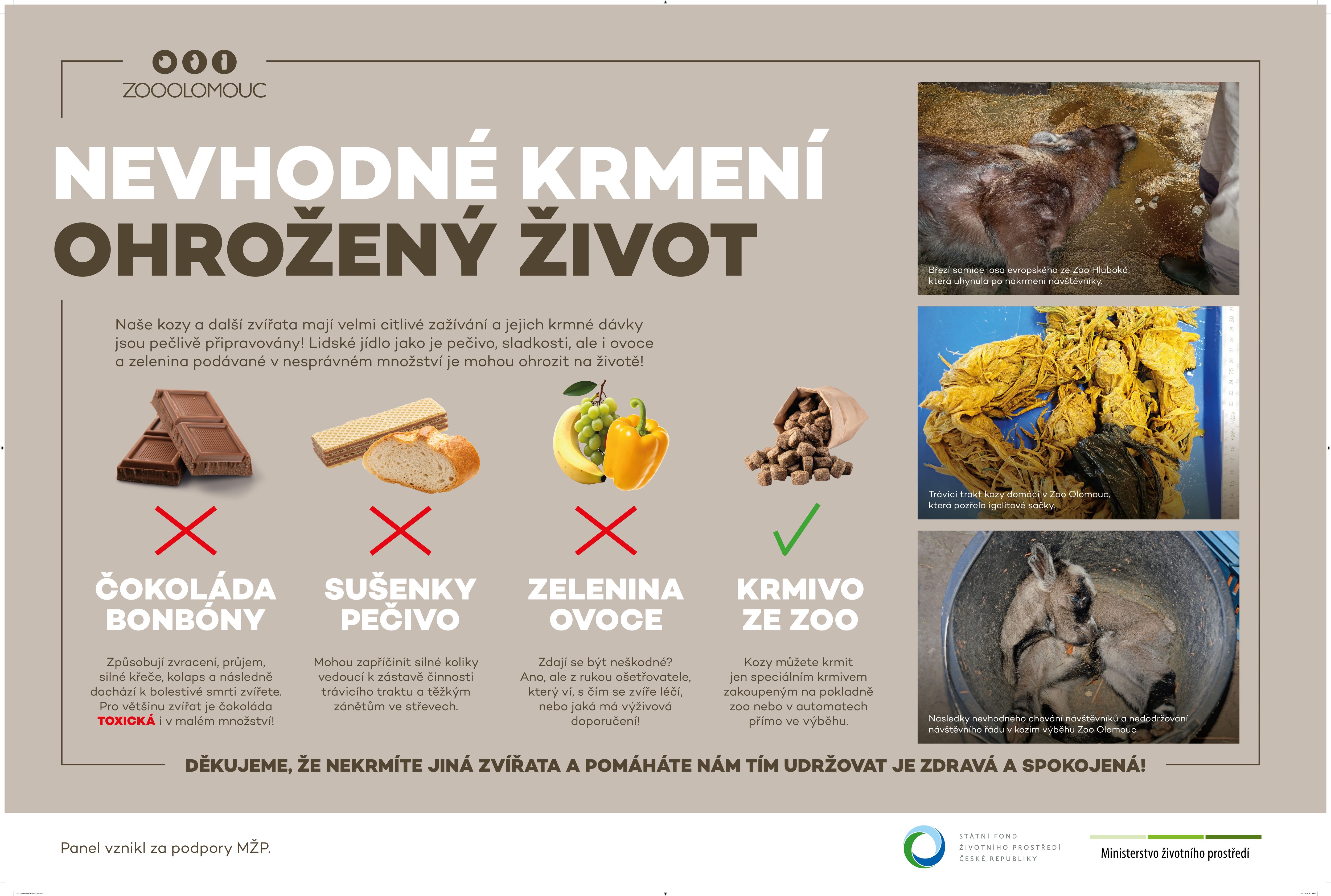 Nevhodné krmení ohrožuje kozy v olomoucké zoo: Olomoucká zoo instalovala u koz novou edukativní ceduli a znovu upozorňuje na časté porušování návštěvního řádu. Nevhodné krmení či upuštěné igelitové sáčky mohou kozám způsobit vážné zdravotní potíže končící i úhynem. Zoo prosí o klid ve výběhu, ohleduplnost a krmení pouze zakoupeným krmivem.