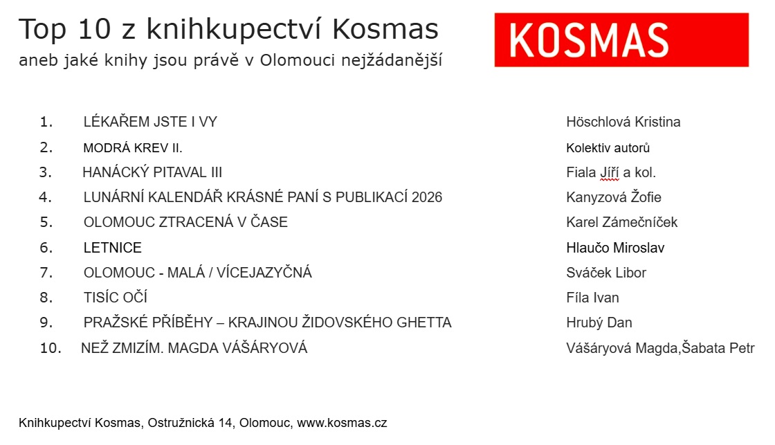 Knihkupectví Kosmas pro vás připravilo pravidelný přehled knih, o které je v Olomouci největší zájem. Nechte se inspirovat a podívejte se na aktuální TOP 10 prodeje.