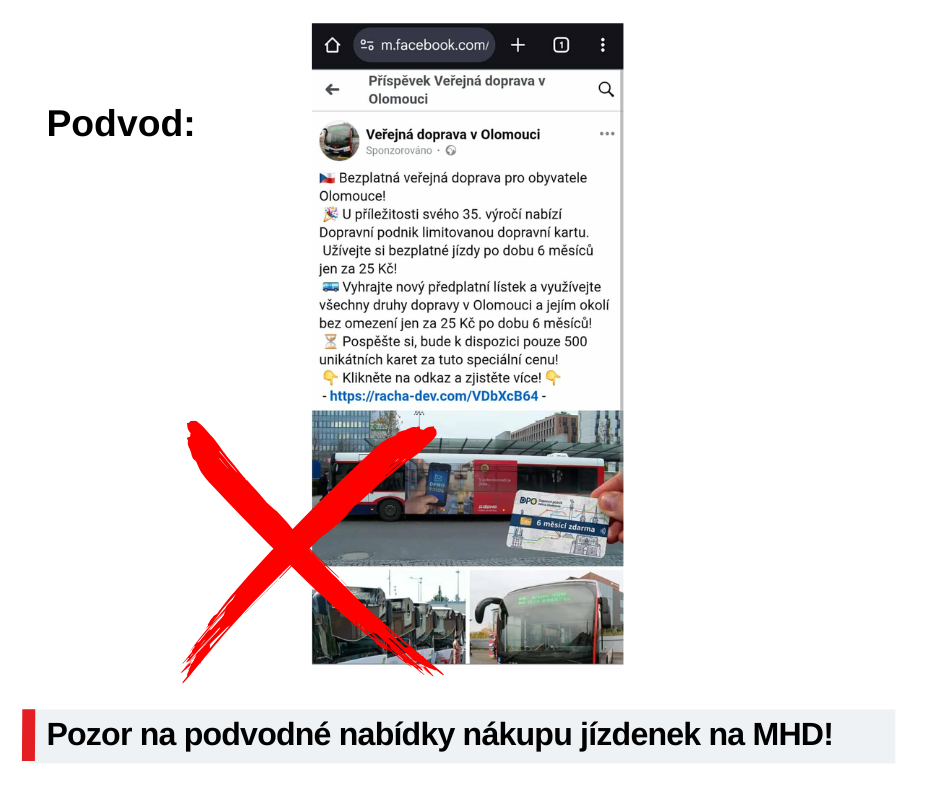 DPMO upozorňuje na podvod: Upozorňujeme cestující, že se znovu na sociálních sítích objevují nabídky nákupu dlouhodobého kuponu na MHD v Olomouci za 2 €/50 Kč/25 Kč a podobné velmi nízké ceny. Dlouhodobé jízdenky DPMO je možné zakoupit pouze přes oficiální e-shop nebo na pokladnách. Buďte opatrní a nenaleťte podvodníkům!