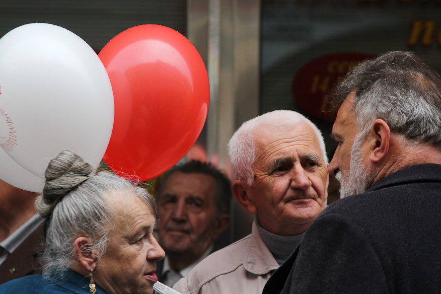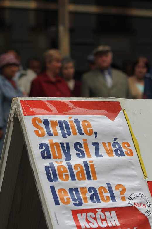 Svátek práce nebo lásky čas? První máj včera oslavili i komunisté. Před Priorem se jejich příznivců převážně v důchodovém věku sešla asi stovka.
