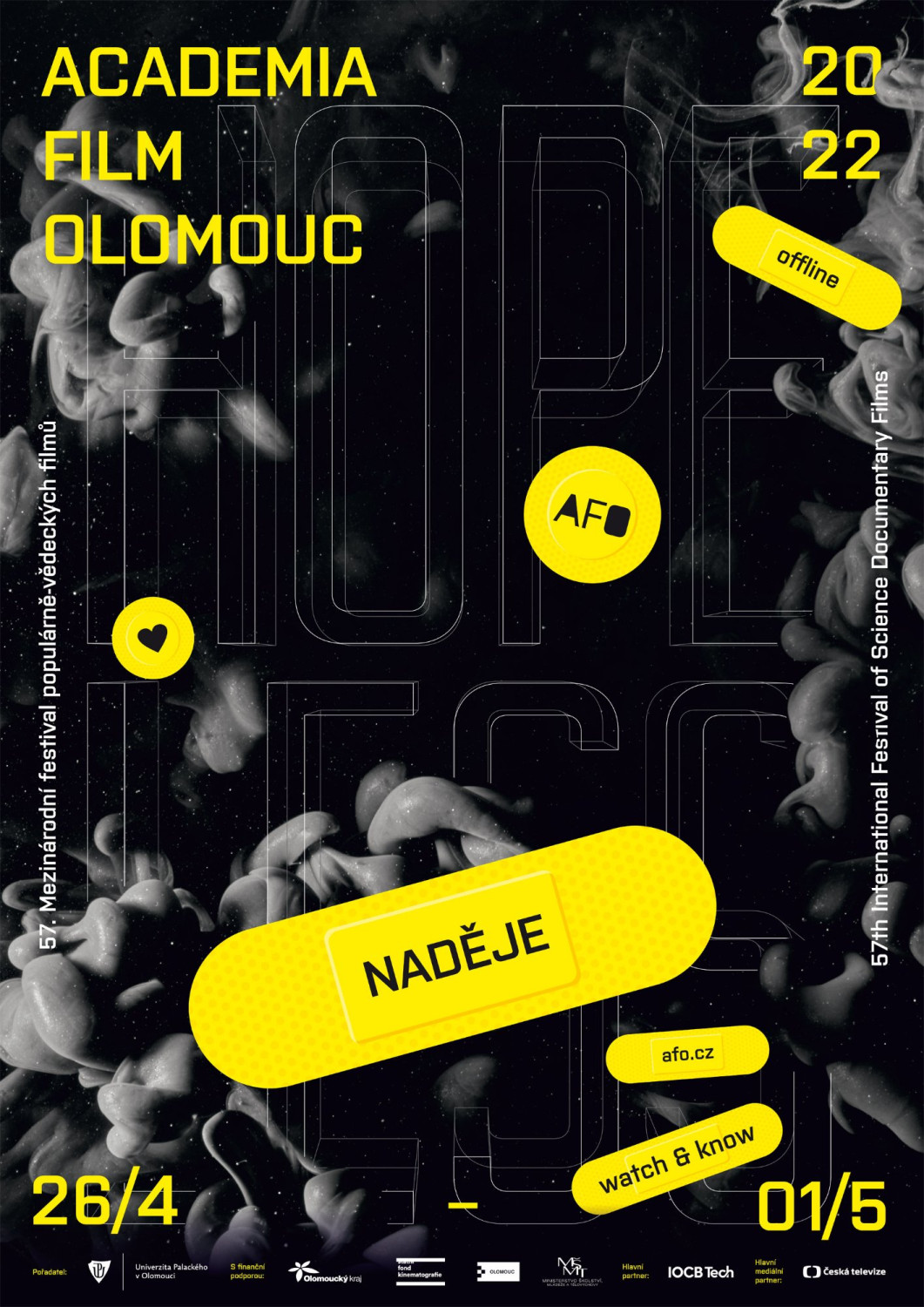 Špičkové vědecké dokumenty, inspirativní přednášky, filmové workshopy, hudební produkce, exkurze, výstavy i program pro děti. Svátek všech filmových fanoušků a tvůrců Academia Film Olomouc (AFO), který pořádá Univerzita Palackého v Olomouci, se letos koná 26. dubna až 1. května a přinese téma Naděje. Tým festivalu věří, že je to téma, které je ve společnosti třeba neustále připomínat a zároveň kriticky zkoumat.