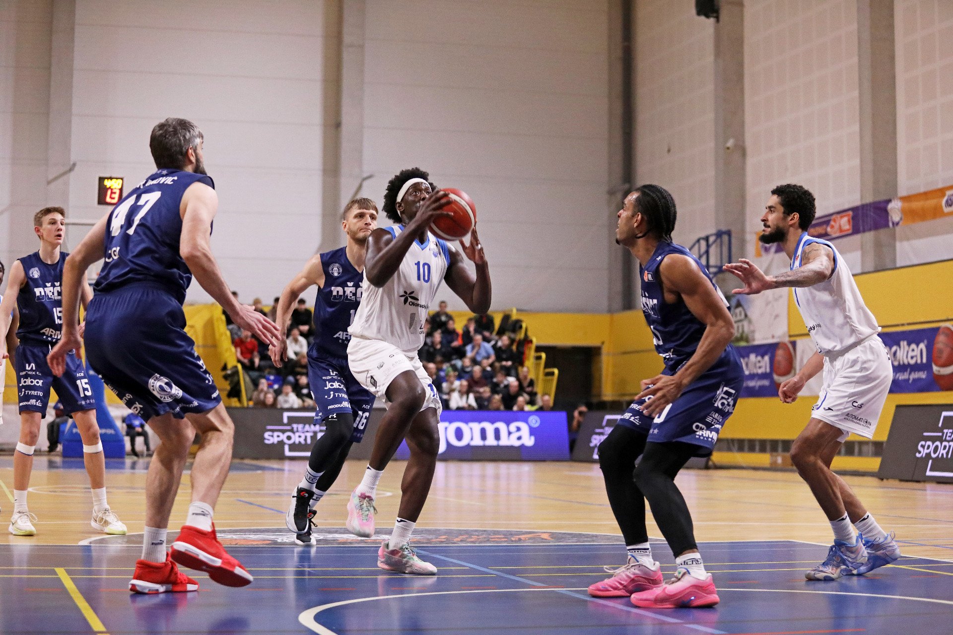Ve vedení se domácí drželi až po 15. minuty, kdy jejich soupeř trefil dvě trojky v řadě a otočil průběžný výsledek. Po sérii šestnácti bodů v řadě nakonec Pardubice odskočily do dvouciferného vedení a Olomoucko stačilo do poločasu upravit na 36:40.