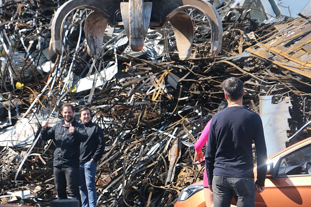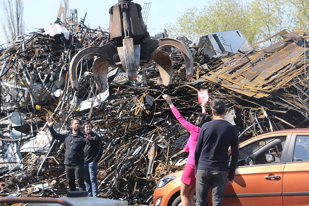 Kovošrot Vladimír Stolička nás přivítal velmi vřele a velmi ochotně přistoupil na nedokonané sešrotování auta Dity Kalábové. Natáčení přihlíželi snad všichni, kteří se v areálu zrovna nacházeli. Byla hrozná zima, foukal vítr, ale nikomu to nevadilo. Škoda, že na fotkách není vidět, jak krásné lodičky na jehlovém podpatku Dita měla. Ideální na návštěvu kovošrotu. A pochopitelně i v tomhle případě to byl záměr.