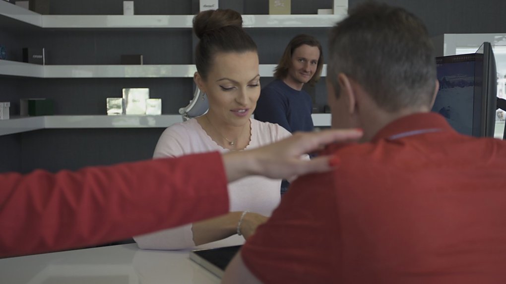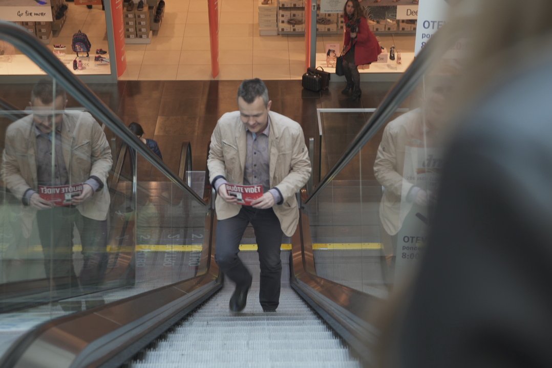 V Galerii Moritz čekal na Radima Pavlíka zdánlivě jednoduchý úkol. To, čím si v obchodních centrech krátí dlouhou chvíli nejedno dítě a rodiče by je za to nejraději "přetrhli". Vyjít eskalátory opačně. Rozjela se kamera, Radim nasadil úsměv a vydal se vstříc výšinám. A ošklivě upadl. I když se na jeho těle začaly vybarvovat modřiny, natáčení dokončil s úsměvem na rtech. A pozorný divák si v jednom z našich spotů všimne drobného zaškobrtnutí, které pádu předcházelo...
