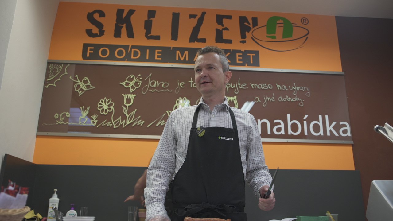 Ve Sklizenu to vypadalo, že neodejdeme. Radim Pavlík se chopil zástěry, nože a pár klobásek a krájel a krájel. Jak jinak než s úsměvem. A smáli se i všichni kolem.