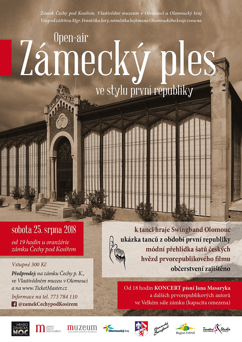 Hradozámecká noc, která letos proběhne v noci ze soboty 25. na neděli 26. srpna, představuje památky v netradiční době a s netradičním programem jako místa neustále živá, na něž má smysl se vracet. Zámek Čechy pod Kosířem se do této celostátní akce zapojí skutečně originálním způsobem. V sobotu 25. srpna se před zámeckou oranžérií bude konat open-air zámecký ples ve stylu první republiky. Krásné prostředí, bohatý program a osmnáctičlenný orchestr zajistí ojedinělý zážitek a vhodnou příležitost k oslavě 100. výročí vzniku Československa.