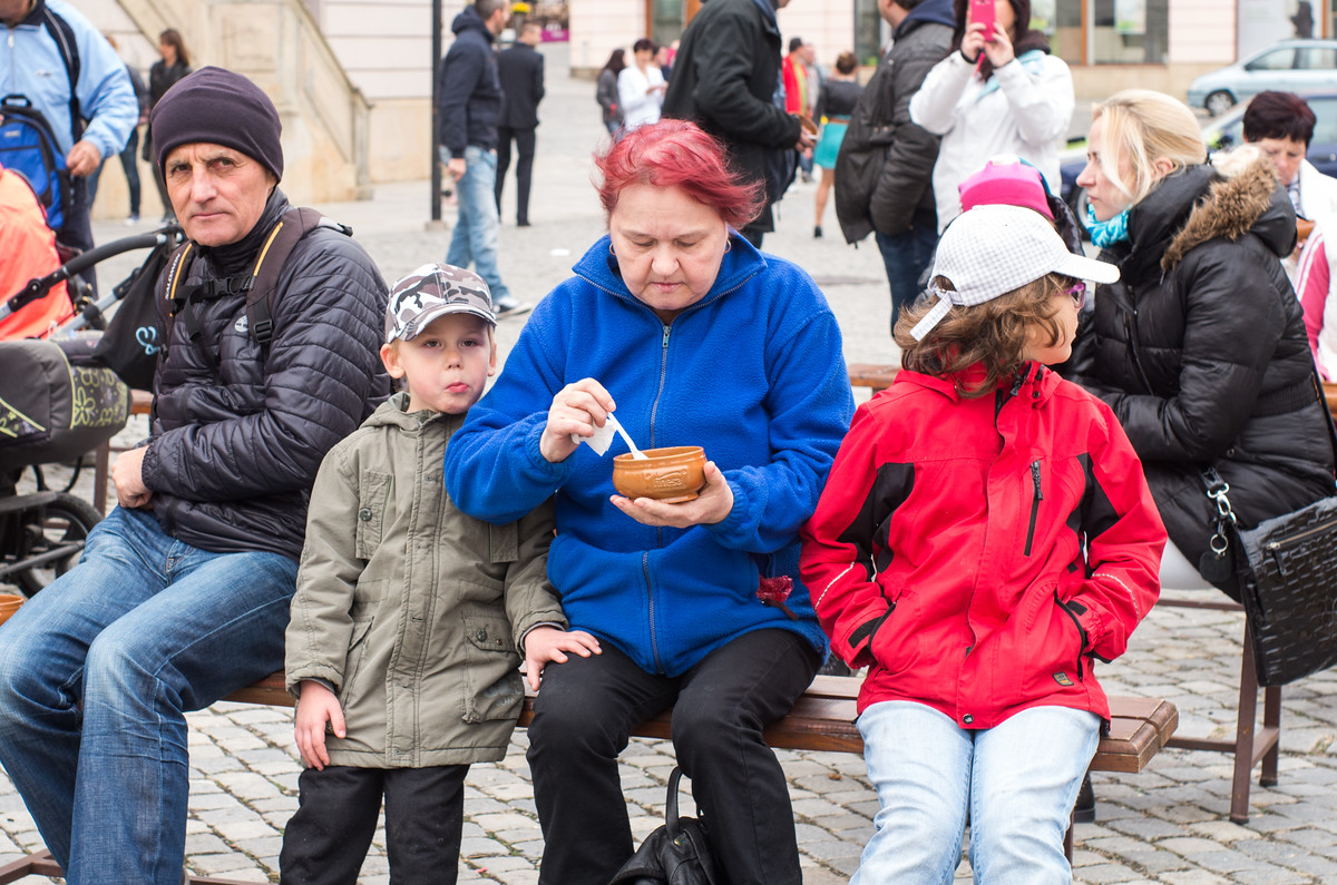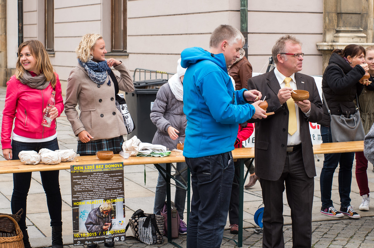 Kolemjdoucí si v sobotu od 11:00 do 14:00 v rámci Dne lidí bez domova mohli přímo na Horním náměstí zakoupit polévku za 50 korun servírovanou v originální keramické misce, ta lidem po snědení polévky také zůstala. Největší zájem byl o gulášovku, která došla zhruba za dvě hodiny, o něco později už byla vyprodaná také zelňačka, lidé se tak museli spokojit s čerstvě navařenou bramboračkou nebo domácí slivovicí, která v sychravém počasí zahřála neméně kvalitně. "Zájem o první ročník charitativní akce byl obrovský, překvapilo nás během jaké chvilky se polévka prodala," popsala předsedkyně Dobrého místa pro život Věra Novotná, která akci Den lidí bez domova pořádala.