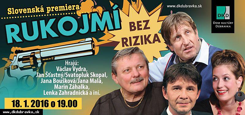 Reduta, 27. prosince, 19:00Těsně po vánočních svátcích si můžete přijít odpočinout do Reduty na francouzskou komedii s kriminální příchutí – Rukojmí bez rizika. Dva letití kamarádi si vzájemně svěří stejný úmysl spáchat sebevraždu, pro niž má každý odlišné důvody. Společná sebevražda se jeví jako ideální řešení, ale plán jim překazí trojice prchajících amatérských lupičů s plným pytlem peněz. Ti vtrhnou do bytu, překvapené sebevrahy si vezmou jako rukojmí a vyhrožují jim zabitím, což je právě to, co si oba muži nejvíce přejí. Ale při pohledu na pytel plný bankovek dostávají oba hrdinové znovu chuť do života... V hlavních rolích se představí Václav Vydra, Jan Šťastný a Svatopluk Skopal. Vstupenky kupujte zde.