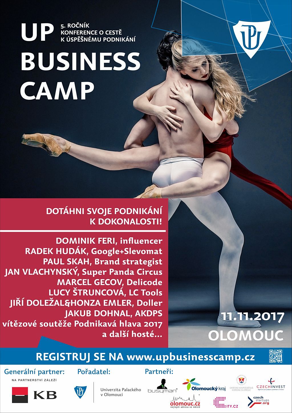 Marcel Gecov, vicemistr světa ve fotbale do 20 let ,nebo Jan Vlachynský, spolumajitel brněnských podniků Bar, který neexistuje, Super Panda Circus a 4pokoje. Oba přijedou 11. listopadu na pátý ročník univerzitní konference UP Business Camp, kde poodhalí úspěchy svého podnikání. Společně s nimi do Olomouce dorazí i historicky nejmladší radní v ČR a student práv Dominik Feri. Na konferenci chce motivovat mladé lidi k podnikání a aktivní roli ve společnosti. Novinkou letošního ročníku konference bude v angličtině vedený workshop o budování značky s Paulem Skah, který má za sebou tvorbu strategií pro takové firmy, jako jsou Orange nebo HBO. Organizátoři připravili i workshop s Jakubem Dohnalem z advokátní kanceláře DOHNAL PERTOT SLANINA, který přiblíží úskalí podnikání a nabídne praktické rady z právního pohledu.