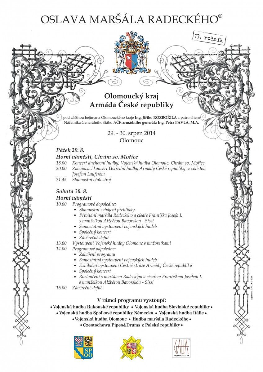 Oslavy zahájí v pátek 28. srpna v 18:00 koncert duchovní hudby ve chrámu svatého Mořice, poté se program přesune na Horní náměstí, kde bude pro diváky připraven zahajovací koncert Ústřední hudby Armády České republiky, první den vyvrcholí v 21:30 ohňostrojem. V sobotu budou na programu především vystoupení vojenských kapel, chybět však nebude ani příjezd a odjezd samotného maršála Radeckého, závěrečné defilé mažoretek.