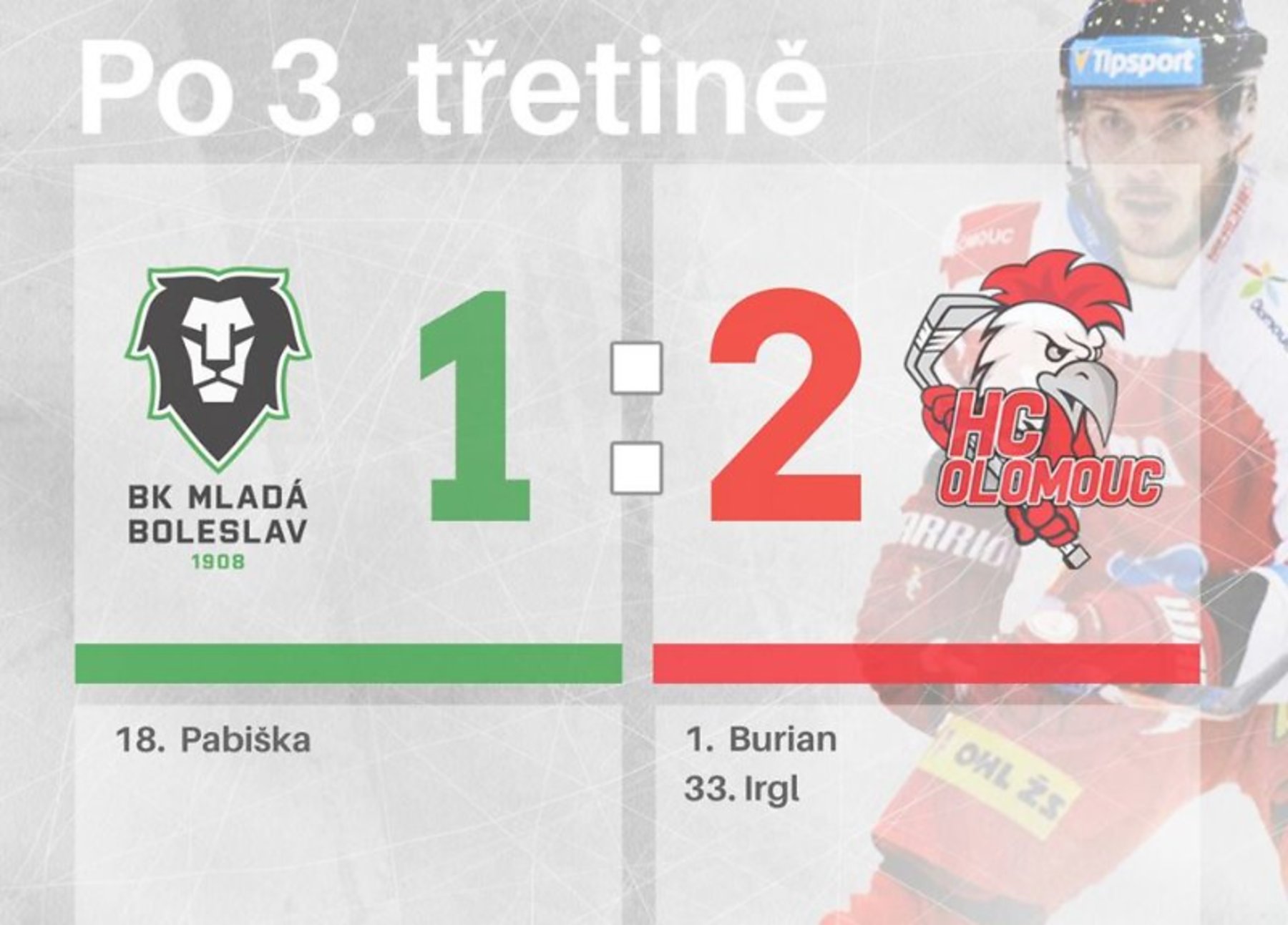 Po páteční výhře nad Plzní se Olomouci podařilo vyhrát i v dnešním zápase v Mladé Boleslavi, kterou porazili 2:1. Do vedení šli už v první minutě zásluhou Buriana, rozhodující gól přidal ve druhé třetině Zbyněk Irgl.