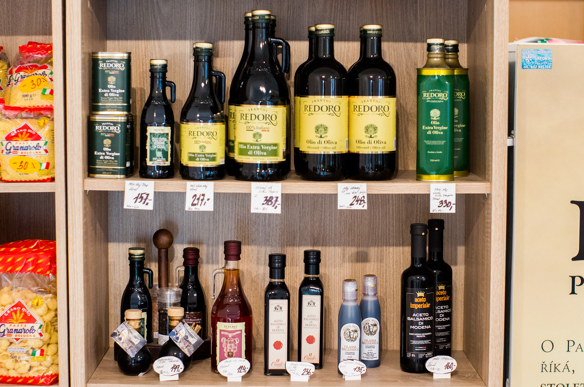 Důležitou součástí italské kuchyně je bezesporu olivový olej a víno, i těch tady mají dostatek. "Olivový olej nabízíme extra panenský z oblasti Lago di Garga. Rozdíl oproti supermarketovým, které zpravidla vyrábějí z druhotně zpracovaných oliv nebo smícháním několika olejů, poznáte, už když si přivoníte a ochutnáte," popsal výjimečnost olejů, které vznikají poblíž Verony, Andrýsek.