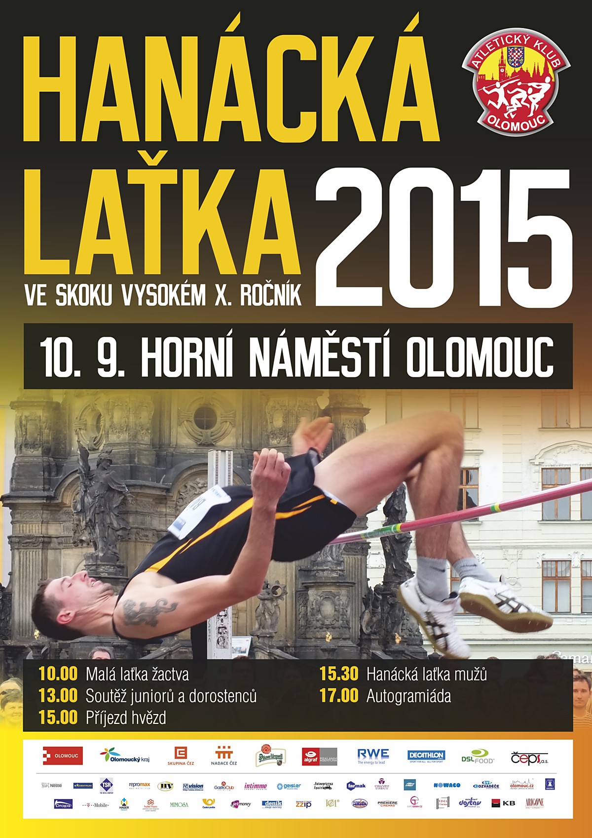 Ve čtvrtek se bude konat jubilejní 10. ročník výškařské exhibice Hanácká laťka 2015. Skákat se bude tradičně před radnicí na Horním náměstí v Olomouci. Pozváni jsou nejlepší čeští i slovenští výškaři v čele s Jaroslavem Bábou, který zaznamenal na nedávno skončeném MS v atletice v Pekingu druhé nejlepší umístění naší výpravy, když skončil na sedmém místě výkonem 229 cm.