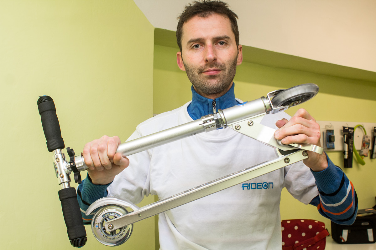 Lukáš Milar je jedním z průkopníků koloběžkování v Olomouci. Před časem si založil firmu RideOn a začal organizovat výlety na koloběžkách po okolí. Jak si tento dopravní prostředek získával čím dál věští oblibu, šel trendu naproti a na konci listopadu otevřel v Denisově ulici vlastní obchod. “Sledoval jsem to postupně. Když jsem začínal, dívali se na mě jako na blázna. Na koloběžce jsem potkal tak jednoho člověka za týden. Loni to byli tak dva až tři. Teď už je potkávám několikrát denně. Je to velký boom,” vysvětluje Lukáš Milar, proč se rozhodl otevřít pod názvem firmy RideOn i vlastní prodejnu. Koloběžka podle něj není určena pro konkrétní cílovou skupinu, s nadsázkou říká, že na ní může jezdit kdokoliv od jednoho roku třeba do stovky. “Děti ji milují, ale často na nich jezdí i dospělí. Koloběžka je totiž výborný dopravní prostředek. Na rozdíl od kola na ní totiž posilujete většinu svalů, nejen dolní polovinu těla. Po cestě do práce si tak můžete báječně zaposilovat,” láká Milar. Koloběžka podle něj pomáhá i na problémy se zády, člověk na ní posiluje zadek, nohy, břicho i ramena. “Je to podobné jako při lezení či plavání. Akorát to můžete dělat každý den,” poznamenává Milar. A zájem je podle něj i mezi seniory: “Dělali jsme pro ně akci a od té doby se nám vrací. Baví je to.”
