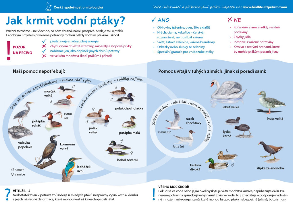 "V menší míře lze použít i kousky nakrájeného nebo rozlámaného vysušeného bílého pečiva a chleba. V žádném případě na nich nesmí být plíseň nebo sůl, ptáci by se mohli přiotrávit a uhynout. Někteří odborníci nedoporučují přikrmovat vodní ptáky pečivem, ale chovatelé vodní drůbeže na to mají opačný názor," vysvětluje Jiří Šafránek.