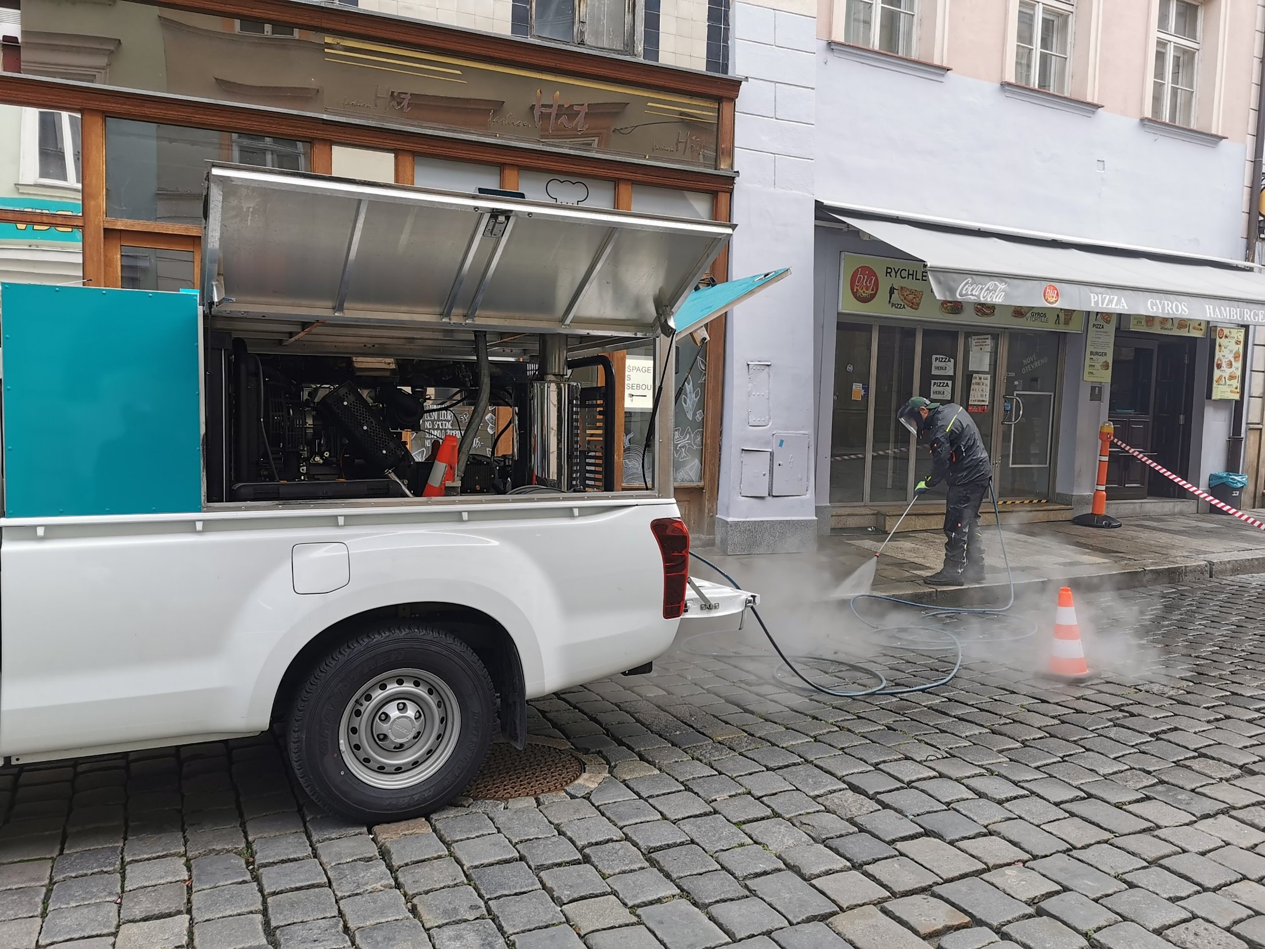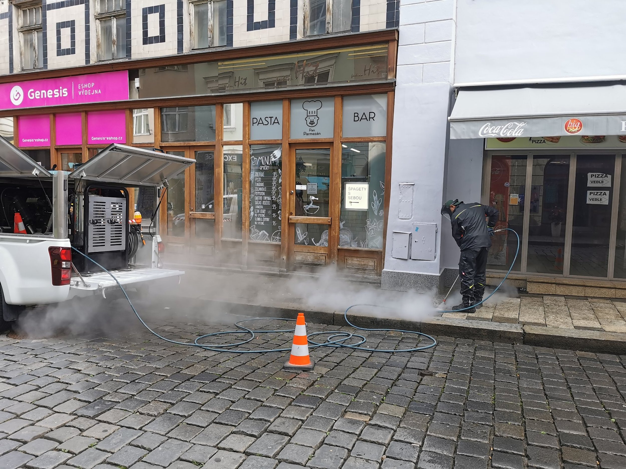 Mastné skvrny na chodnících i zašlapané žvýkačky. Do úklidu v centru města se pustil parní stroj