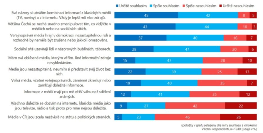 Poslední sledovanou oblastí byla reflexe fungování médií a jejich role ve společnosti. Většina médií (coby zdrojů informací) se těší u veřejnosti stále většinové důvěře (50 % a více). Výjimku tvoří sociální sítě (35 % důvěry) a řetězové e-maily, u kterých je to z hlediska jejich kontroverzí či zneužívání poměrně pochopitelné. Je třeba ale dodat, že je tu stále zhruba pětina populace, která má problémy rozpoznat manipulativní zprávu, spokojí se s jedním zdrojem informací, jemuž důvěřuje, a nepromýšlí provázanost médií a politiky či ekonomiky.