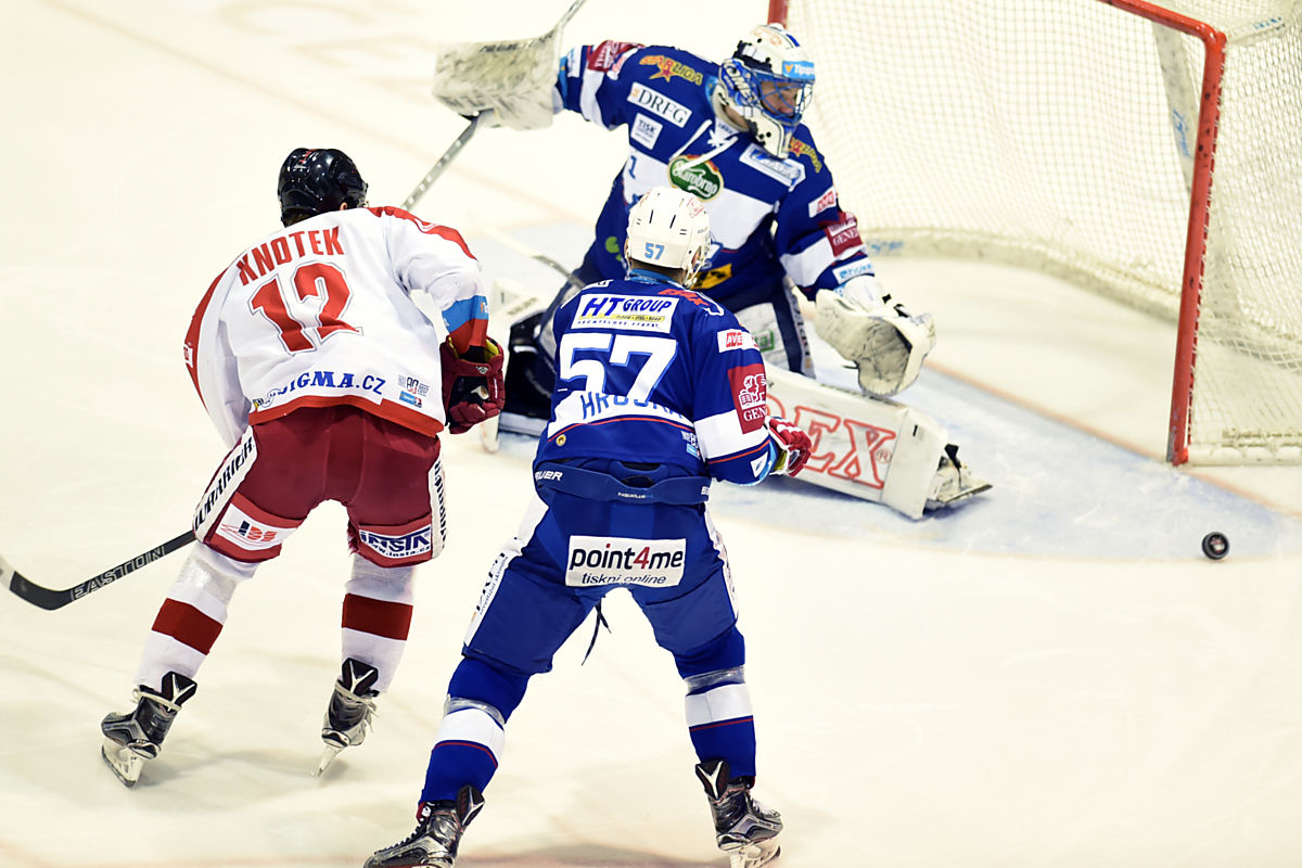 Roman Vlach s pomocí beka Komety Brno Bartejse dává druhý gól Kohoutů.