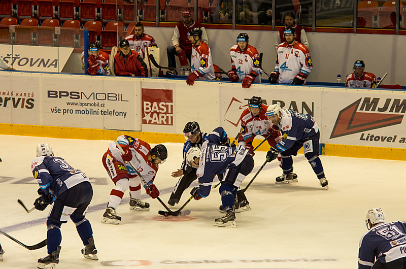Mora zdolala Plzeň 3:2. Na buly Jan Knotek proti Mário Bližňákovi.
