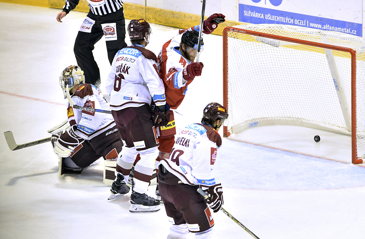 Střední útočník první formace Mory Jan Knotek se raduje s první trefy do sítě Sparty.