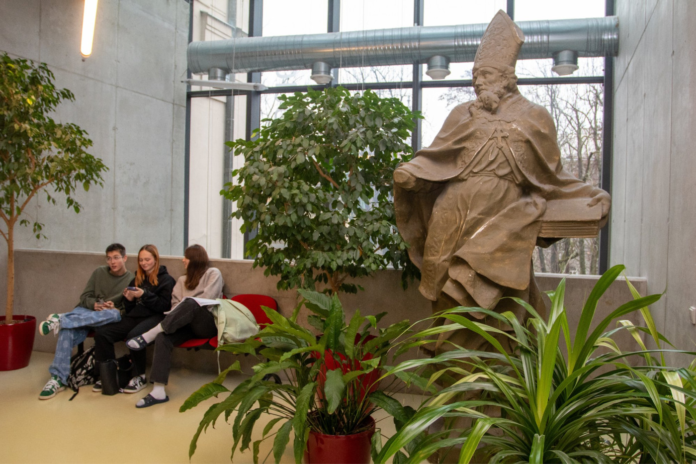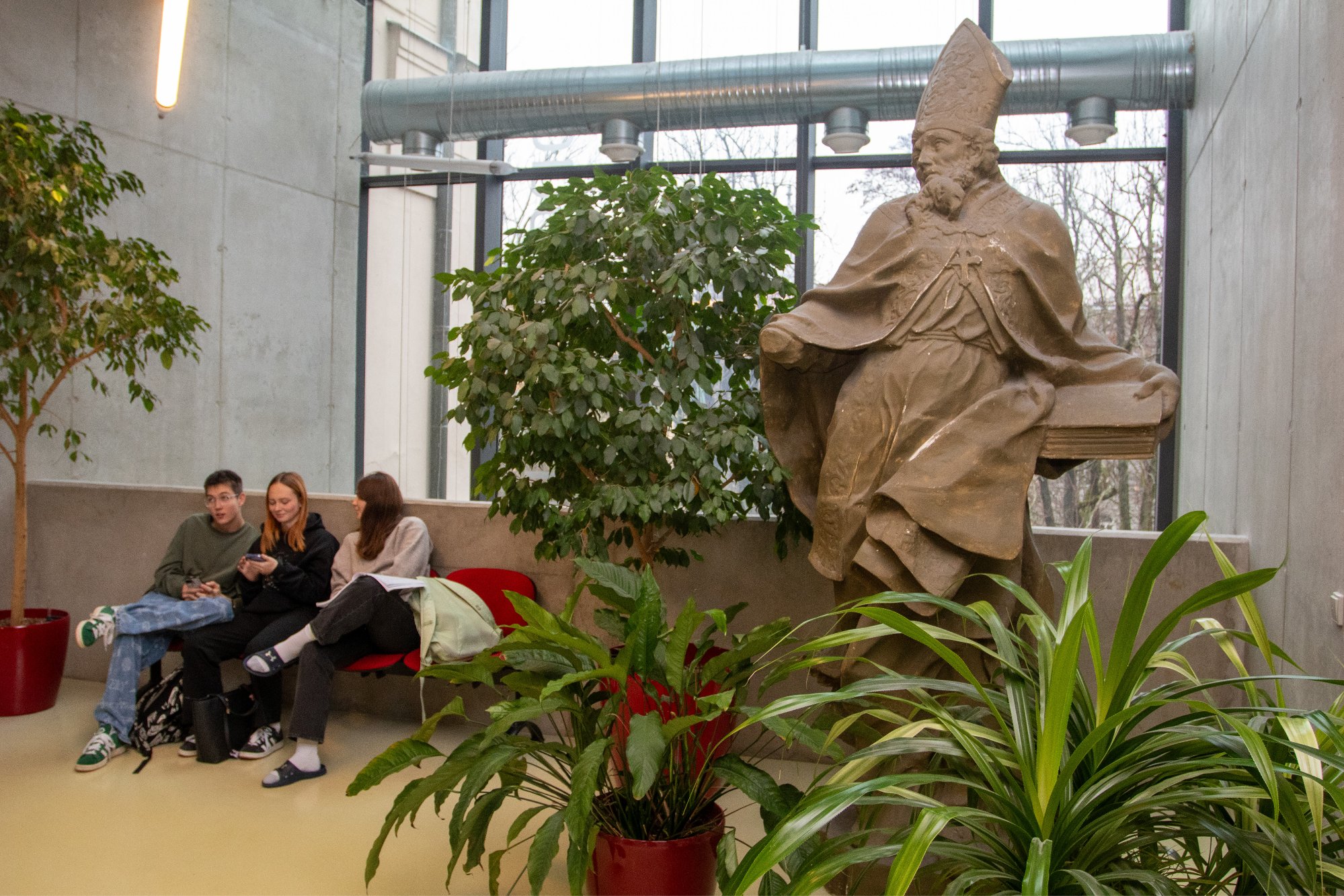 Ve čtyřech patrech přístavby Slovanského gymnázia stojí pozoruhodné sochy. Jsou to kopie světců ze sloupu Nejsvětější Trojice, které vznikly v padesátých letech z odlitků, pořízených během války. Vlastivědné muzeum, které sochy do školy dlouhodobě zapůjčilo, v těchto měsících pracuje na jejich restaurování.