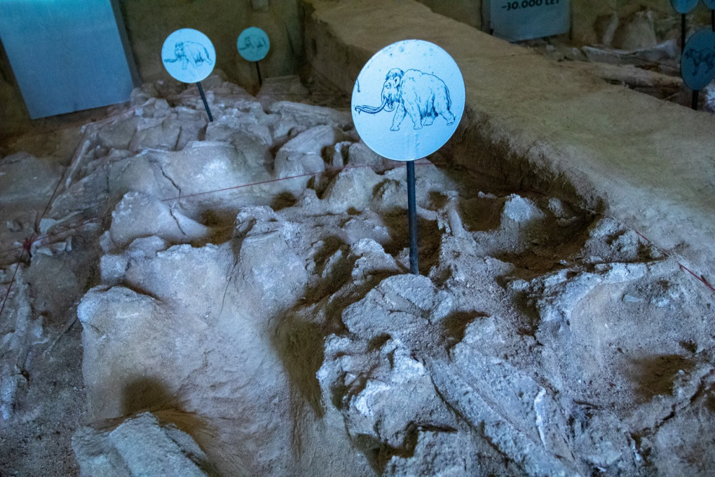 Pod úrovní terénu se zde v letech 2002–2006 našly velké části mamutích kostí a také skelety dalších druhů zvířat. Podle archeologů jde tedy o něco jako pravěkou skládku. "Už pravěcí lidé věděli, že pohazovat kosti zvířat těsně vedle obydlí není dobrý nápad. Vypadá to, že všechno dávali na jednu hromadu mimo svá obydlí. Nejvíce jsou zde zastoupené právě mamutí kosti, ale nachází se zde i další zvířata. Pro návštěvníky je vše zmapováno na informačních cedulkách. Část kostí je navíc pořezána i kamennými nástroji, což dokazuje, jakým způsobem člověk ulovené zvíře zpracovával. U památníku se pak většinou s návštěvníky loučíme a ti pokračují po stezce individuálně dál," uvádí Tomková.