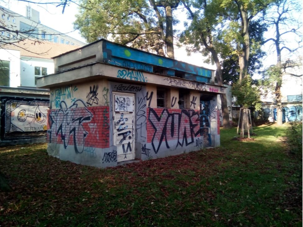 Budova bývalých veřejných toalet se dočká kompletní rekonstrukce. Budou osazena nová okna i dveře, výměna čeká i střechu a podlahy. K objektu také povede nový mlatový chodník. Návštěvníci parku pak uvnitř budovy najdou bezbariérové WC, pisoár, pro maminky s malými dětmi bude k dispozici přebalovací pult a obsluze WC, kterou bude zajišťovat Výstaviště Flora, bude sloužit také sklad potřebného vybavení. V projektu se počítá také s pítkem umístěným na straně budovy směrem k dětskému hřišti. Součástí rekonstrukce bude samozřejmě napojení na kanalizaci a vodovodní přípojku z ulice Palackého, dešťová voda bude zasakována.