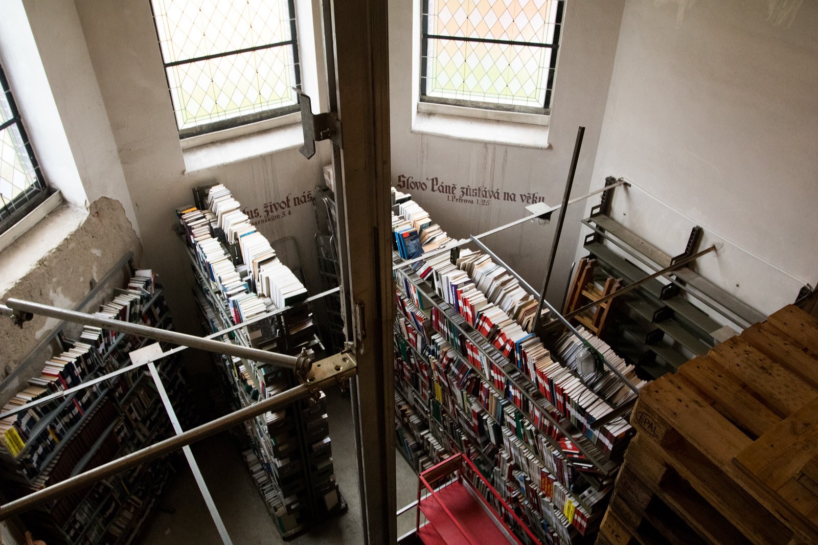 Březen. Vědecká knihovna otevřela nový depozitář v Hejčíně. Po desetiletích tak konečně mohla vyklidit nevyhovující prostory červeného kostela (druhý snímek).