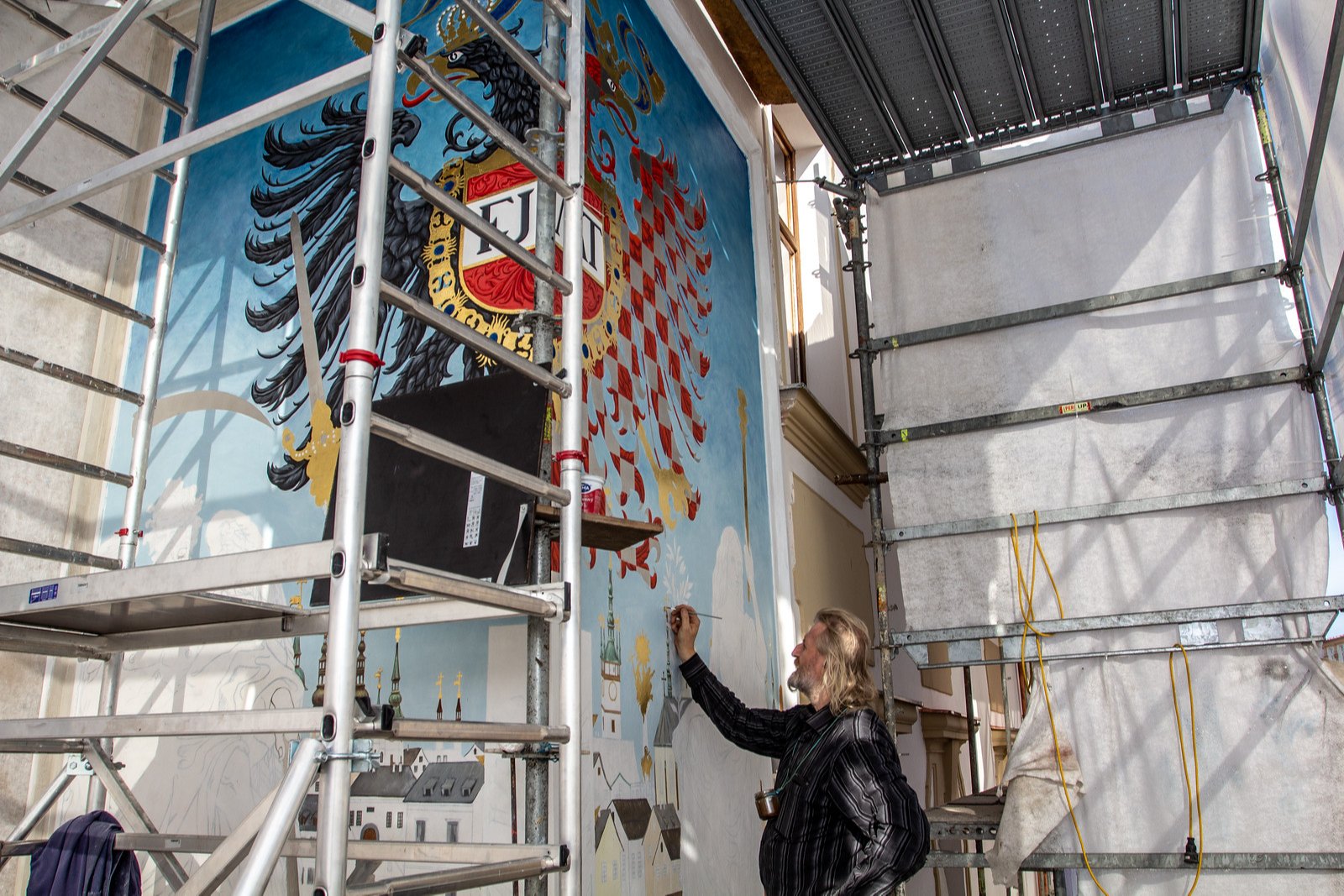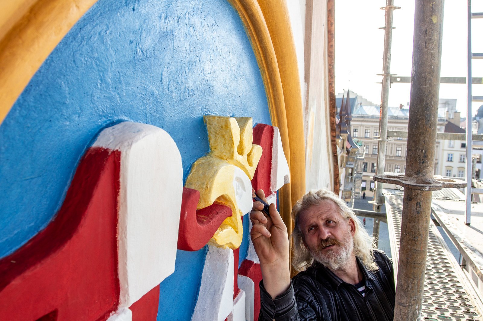 Říjen. Malíř a restaurátor Radomír Surma pracuje na několika projektech na budově rekonstruované olomoucké radnice. Vytváří zde troje sluneční hodiny, restauroval také erb nad orlojem.