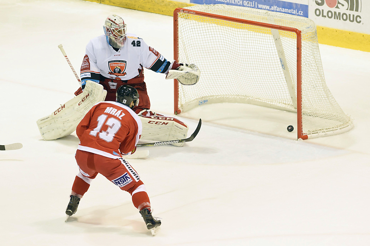 Je tam. Bruno Mráz překonává brankáře Hradce Králové Patrika Rybára. Olomouc tak poráží Mountfield po třech letech.