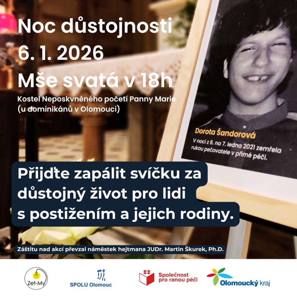 V noci ze 6. na 7. ledna 2021 zemřela Dorota Šandorová, klientka domova pro osoby s mentálním postižením. Její smrt, způsobená nevhodným zásahem pracovníka sociální služby, ukázala potřebu kvalitní, zodpovědné a lidské péče o lidi s postižením. Noc důstojnosti připomíná už počtvrté Dorotin příběh a poukazuje na to, že odpovědnost za podporu lidí, kteří sami nemohou hájit svou důstojnost, nese celá společnost.