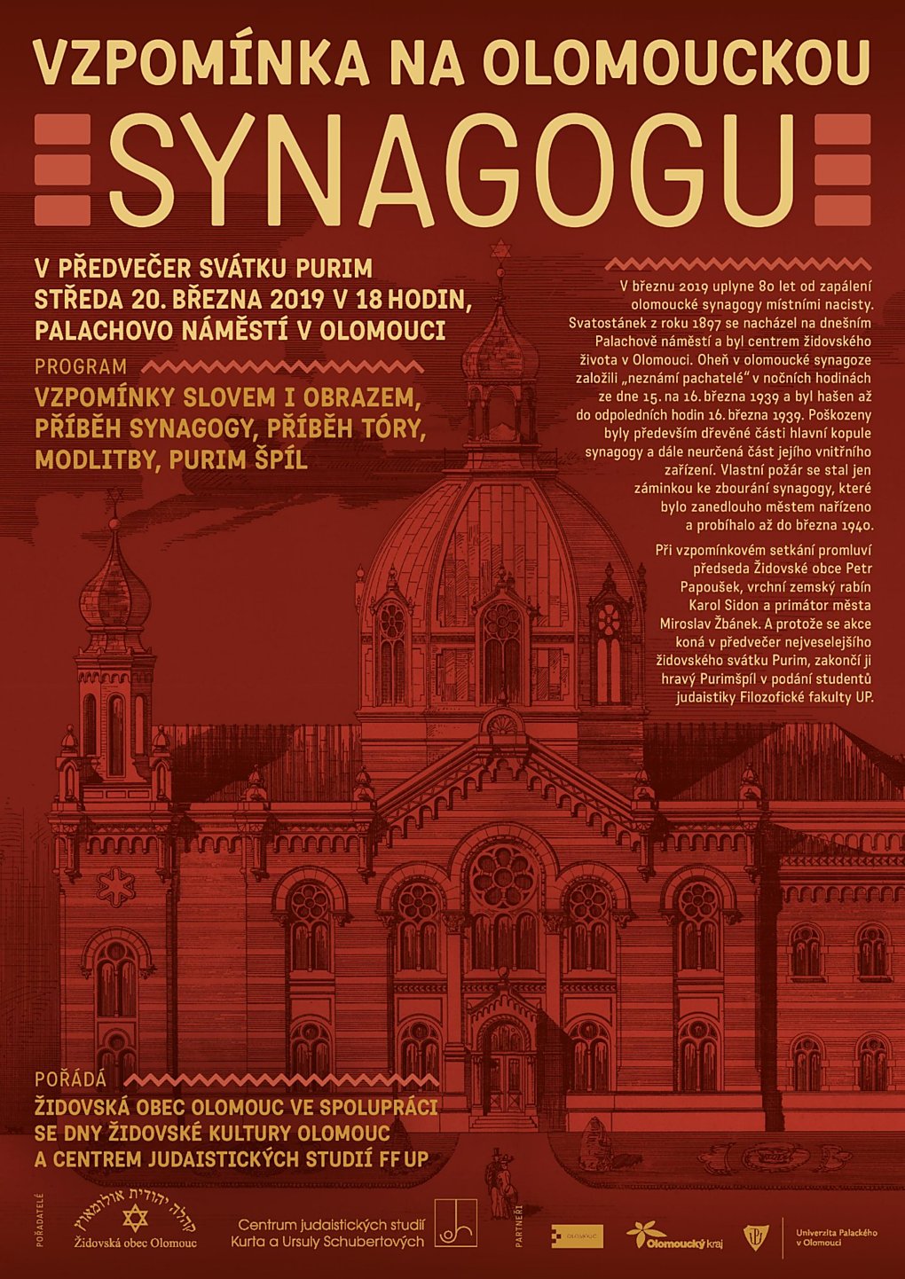 Letos uplynulo 80 let od zapálení olomoucké synagogy nacisty. Oheň ve svatostánku z roku 1897 vzplál v noci z 15. na 16. března 1939. Vlastní požár se stal jen záminkou ke zbourání synagogy, to probíhalo až do března následujícího roku. Ve středu 20. 3. 2019 se na Palachově náměstí uskuteční vzpomínkové setkání.