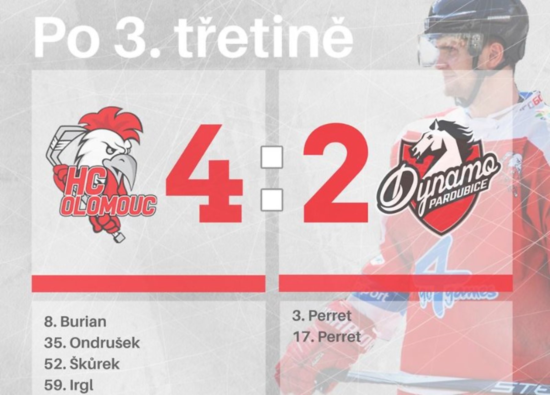 Hokejisté Olomouce zdolali v 11. kole extraligy Pardubice 4:2 a potřetí za sebou naplno bodovali. Hanáci sice dvakrát prohrávali po trefách francouzského útočníka Jordanna Perreta, na ty ale odpověděli Vilém Burian a Jiří Ondrušek. Vítěznou trefu si připsal v 52. minutě David Škůrek a výsledek dovršili domácí 103 sekund před koncem díky technickému gólu Zbyňka Irgla.