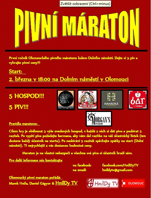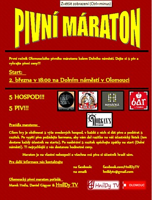 Trochu neobvyklý maraton čeká na začátku března olomoucké ulice poblíž Dolního náměstí. Nebudou se jimi však prohánět běžci, ale milovníci zlatavého moku, kteří budou mít za úkol vypít pět piv v pěti různých hospodách. Na toho, kdo splní úkol nejrychleji, čekají hodnotné ceny.