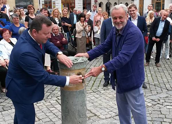 Primátor Antonín Staněk společně s autorem Ivanem Theimerem poprvé vyzkoušeli pítko na Horním náměstí.