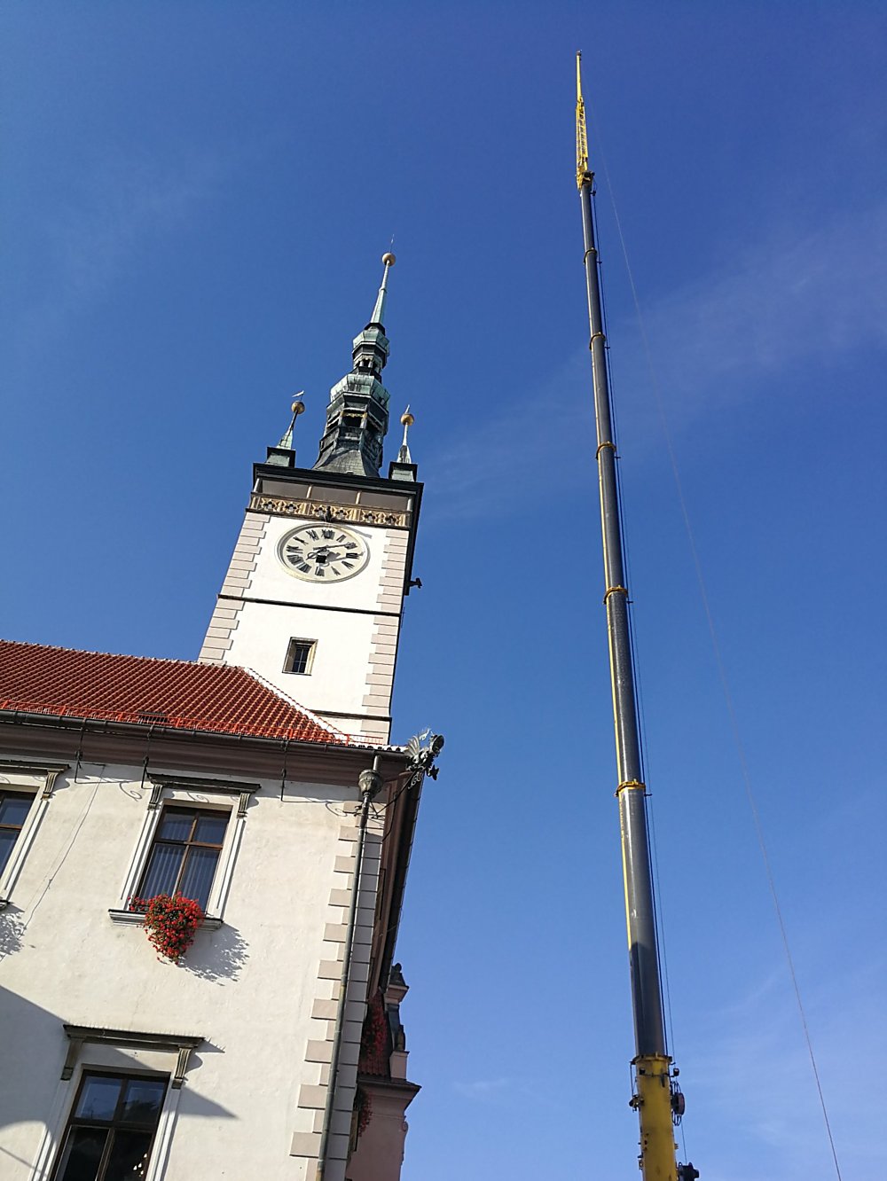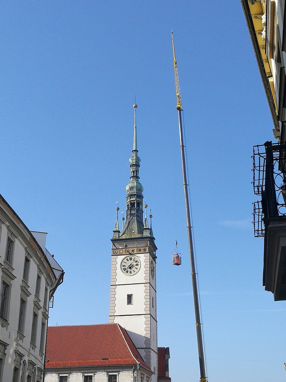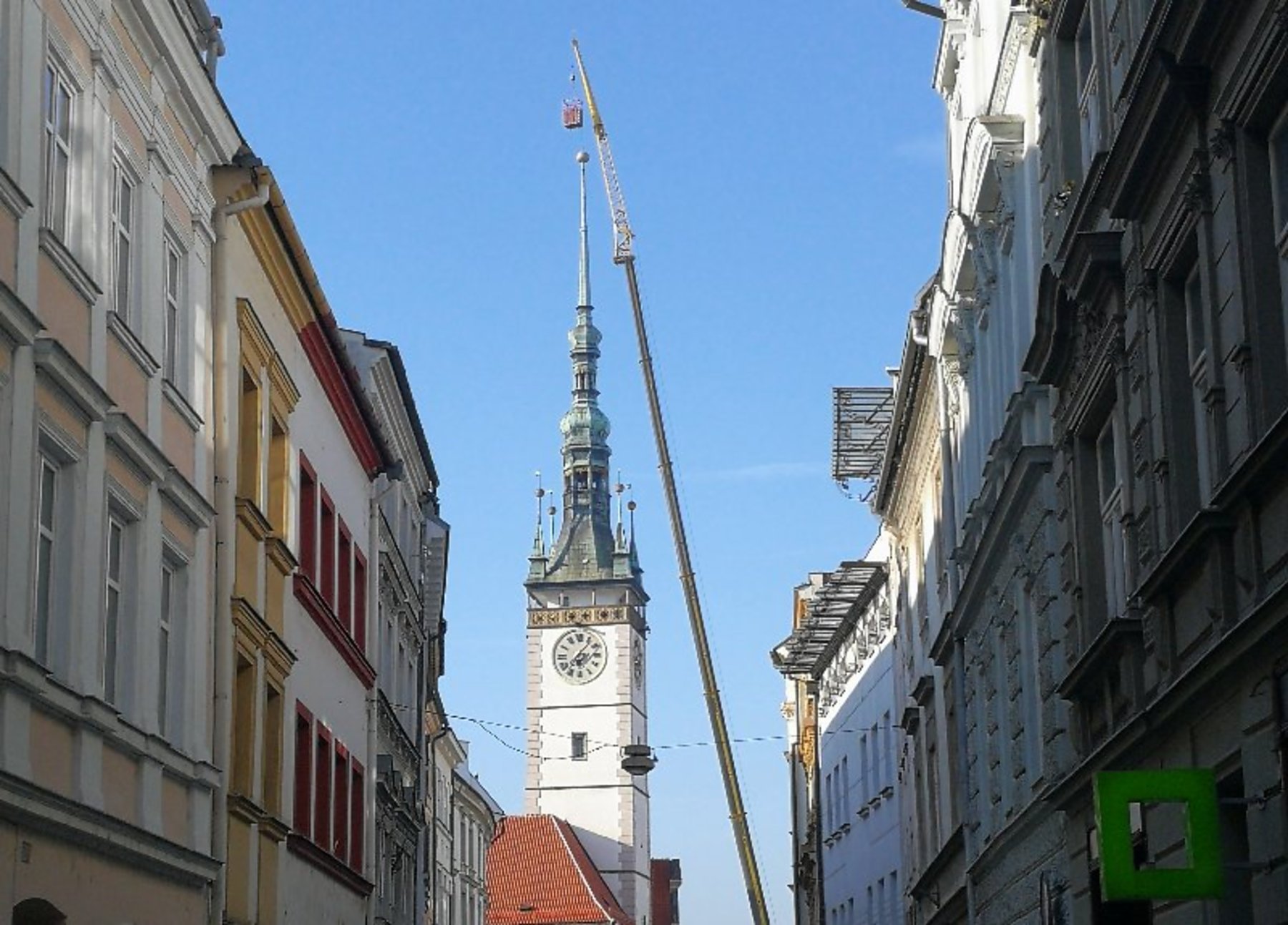 Dnes dopoledne začaly na Horním náměstí dva mobilní jeřáby s výložníky o délce cca 85 metrů demontovat nejvyšší část radniční věže (věž je vysoká 75 metrů). Jedná se o demontáž asi dvanáctimetrové špice věže. "Tato akce je technickou přípravou na chystanou rekonstrukci radniční věže. Práce budou dle stavbyvedoucího trvat nejméně dvě, ale spíše tři hodiny. Až do poslední chvíle se muselo čekat na stav povětrnostních podmínek," uvedl tiskový mluvčí magistrátu Michal Folta.